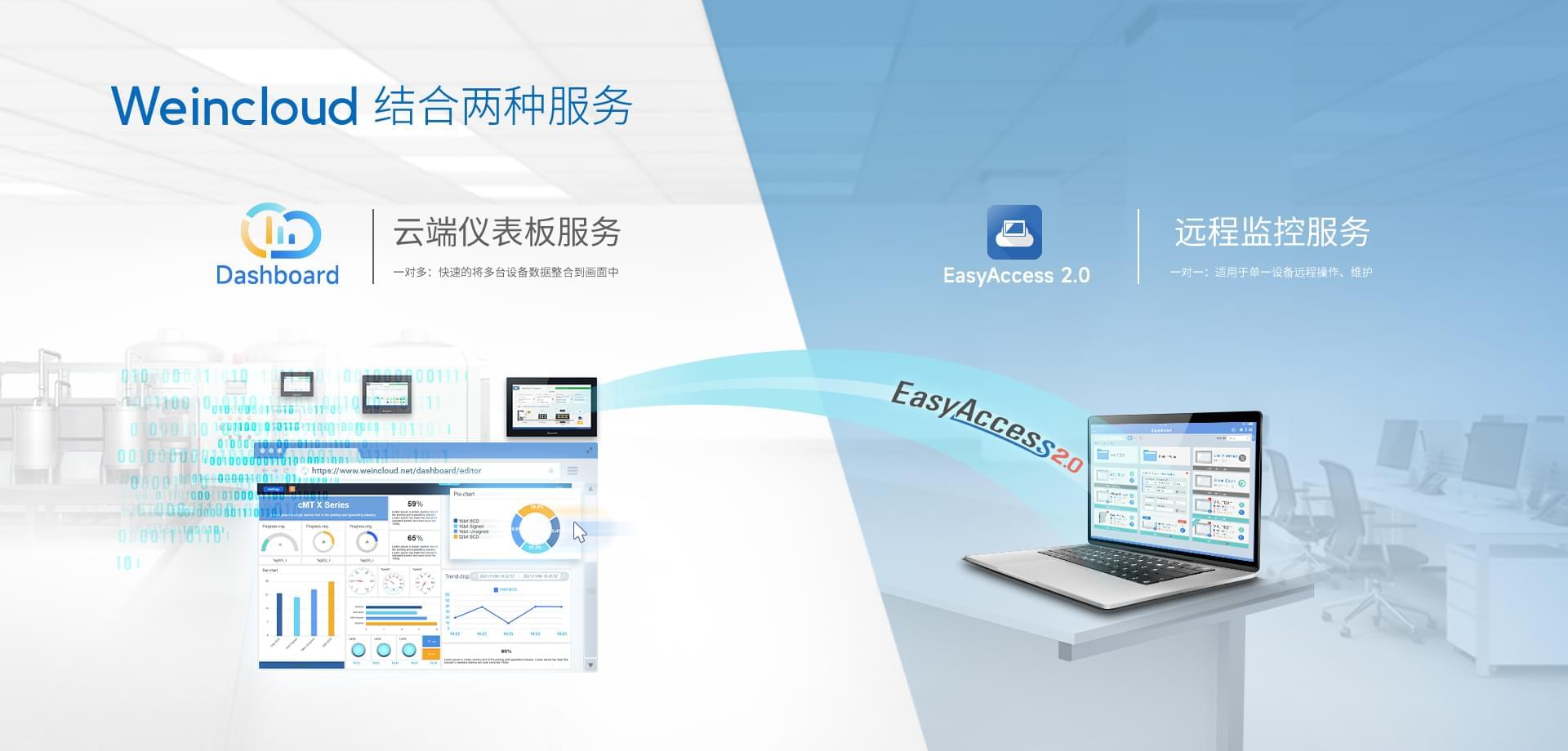Weincloud 集結EasyAccess2.0遠程監控服務及Dashboard云端儀表服務,將設備資料數據上云并以視覺化呈現,協助管理者實時掌控現場產線狀態。